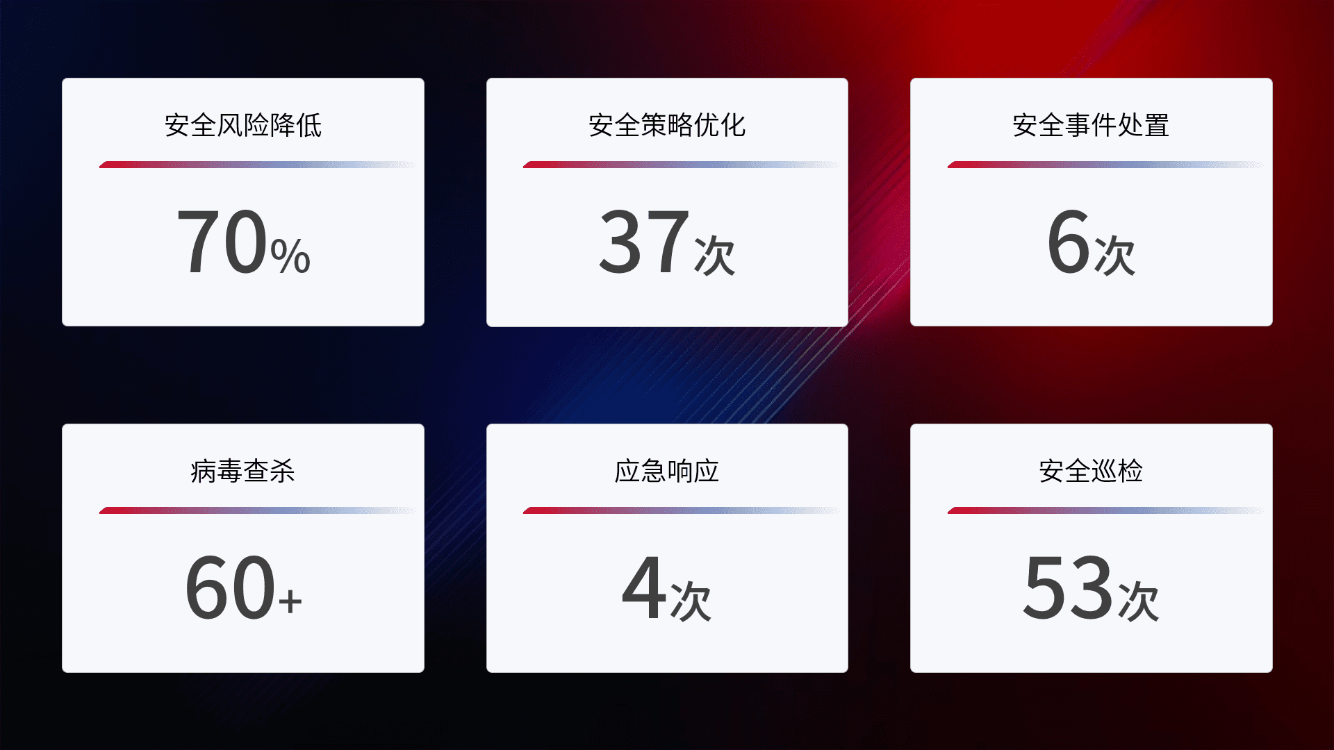 提供全面的安全事件报告体系,,,,包括处置报告、、周报、、季度和年度总结,,结合持续监控,,,,帮助客户深入了解网络安全状况。。。