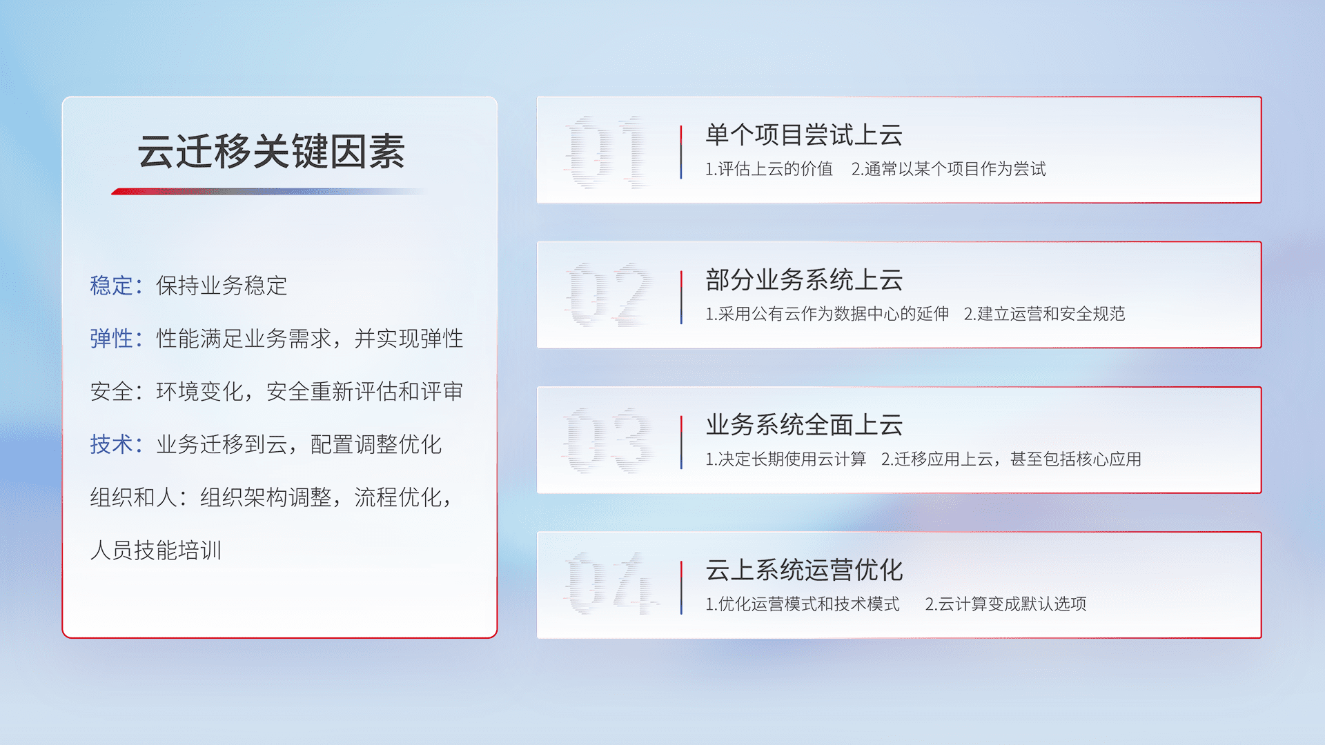 结合实际业务,,从规划设计、、、云平台选型、、云原生改造、、、数据迁移、、集成交付,,迁移全过程为客户识别最佳上云路径,,,,做好风险识别管理,,,,设计网络架构、、身份权限、、安全审计合规、、、、操作审计、、、日志审计、、监控告警策略、、多站点容灾设计等,,对云上基础设施进行整体规划,,,提升IT治理水平,,,,以满足弹性、、、、高可用、、、高性能的需求。。